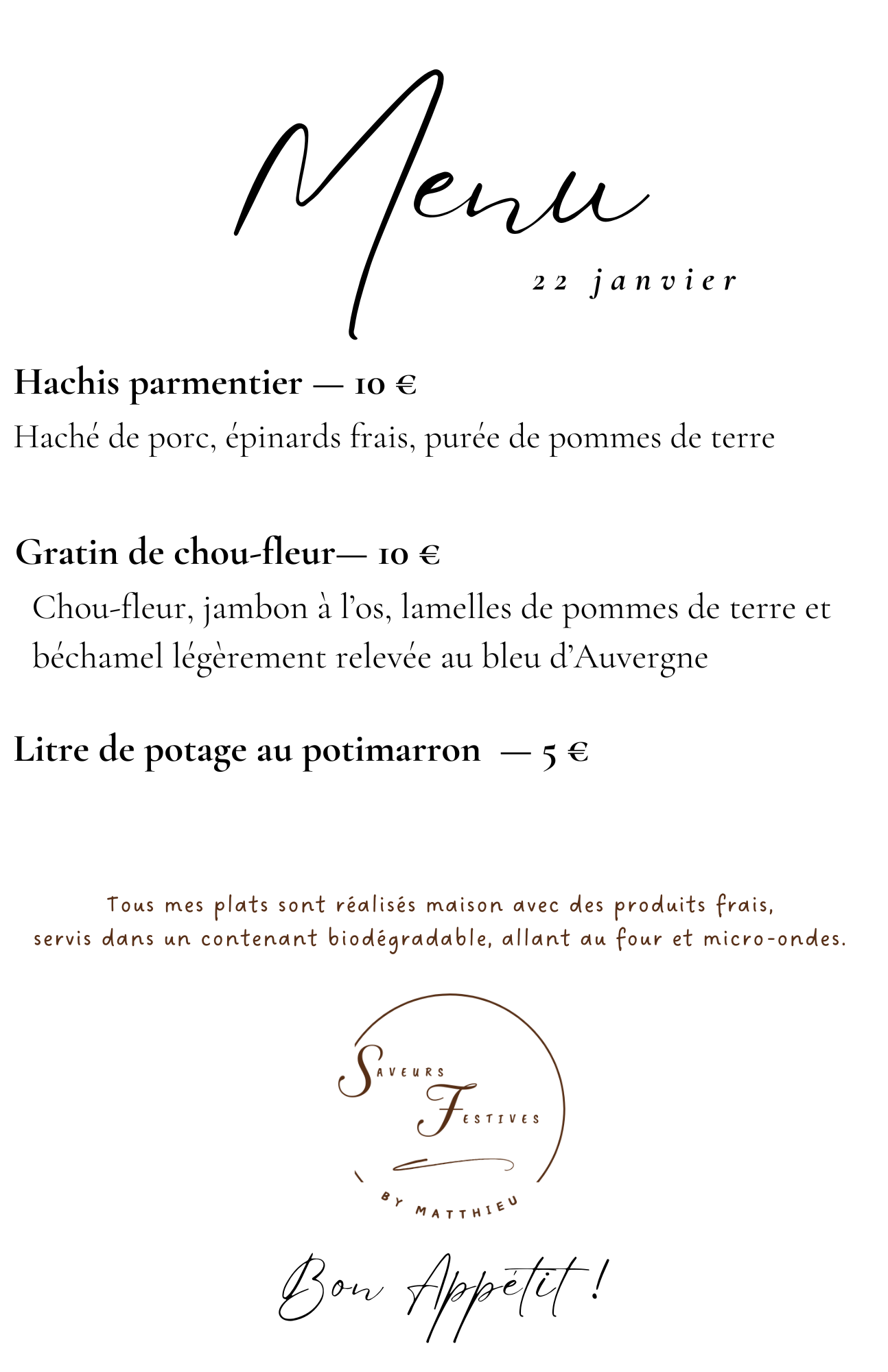 Vous fêtez un événement spécial ? Anniversaire, mariage, communion, fête laïque, baptême, inauguration,… Je livre l’intégralité du menu que vous avez choisi, prêt à réchauffer